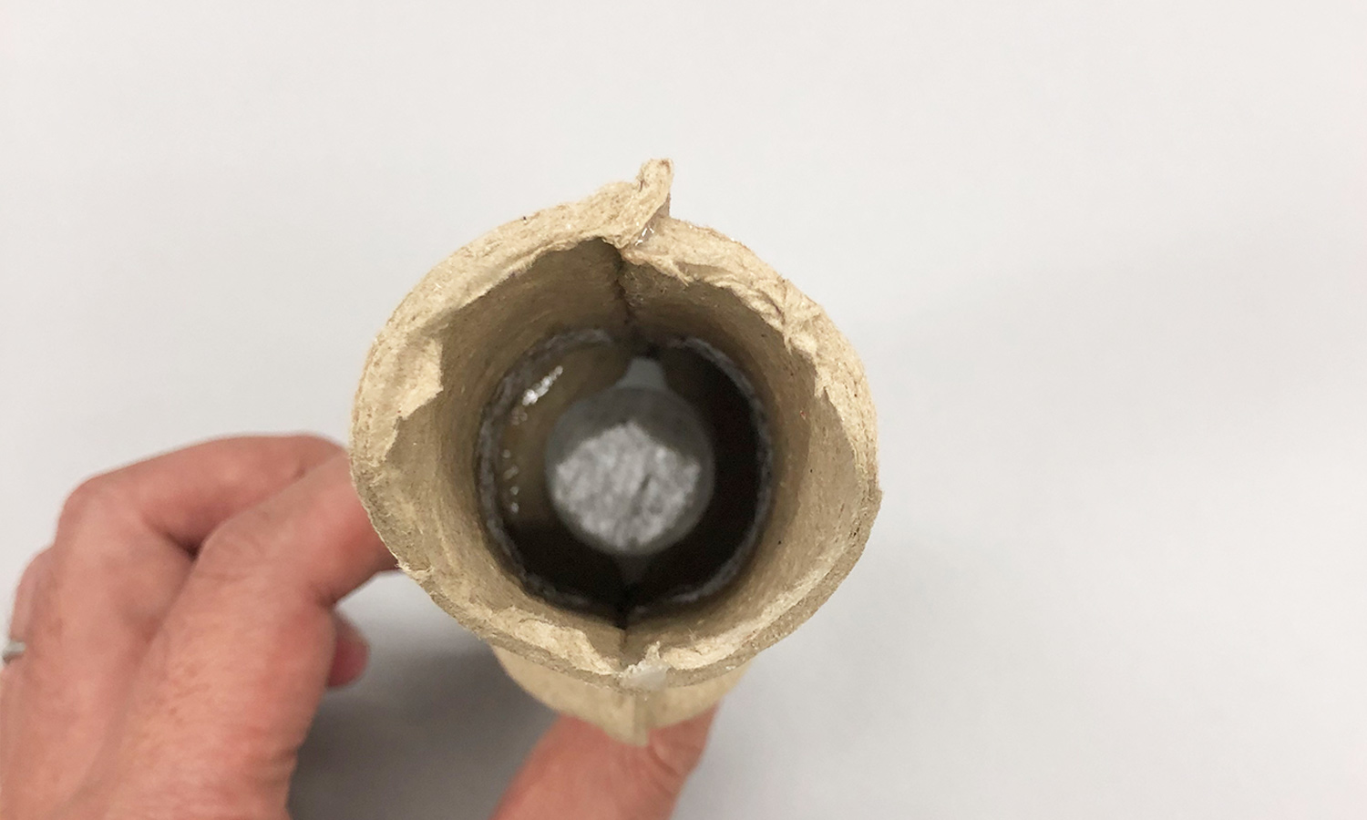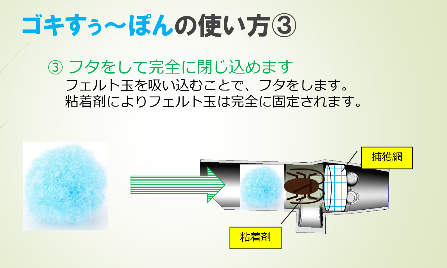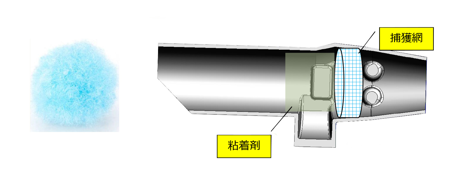 フェルト玉を吸い込むことで、フタをします。粘着剤によりフェルト玉は完全に固定されます。