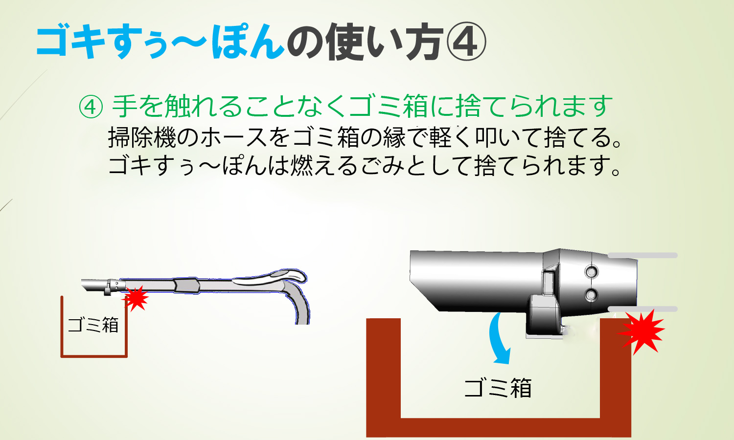 掃除機のホースをごみ箱の縁で軽く叩いて捨てる。ゴキすぅ~ぽんは燃えるゴミとして捨てられます。